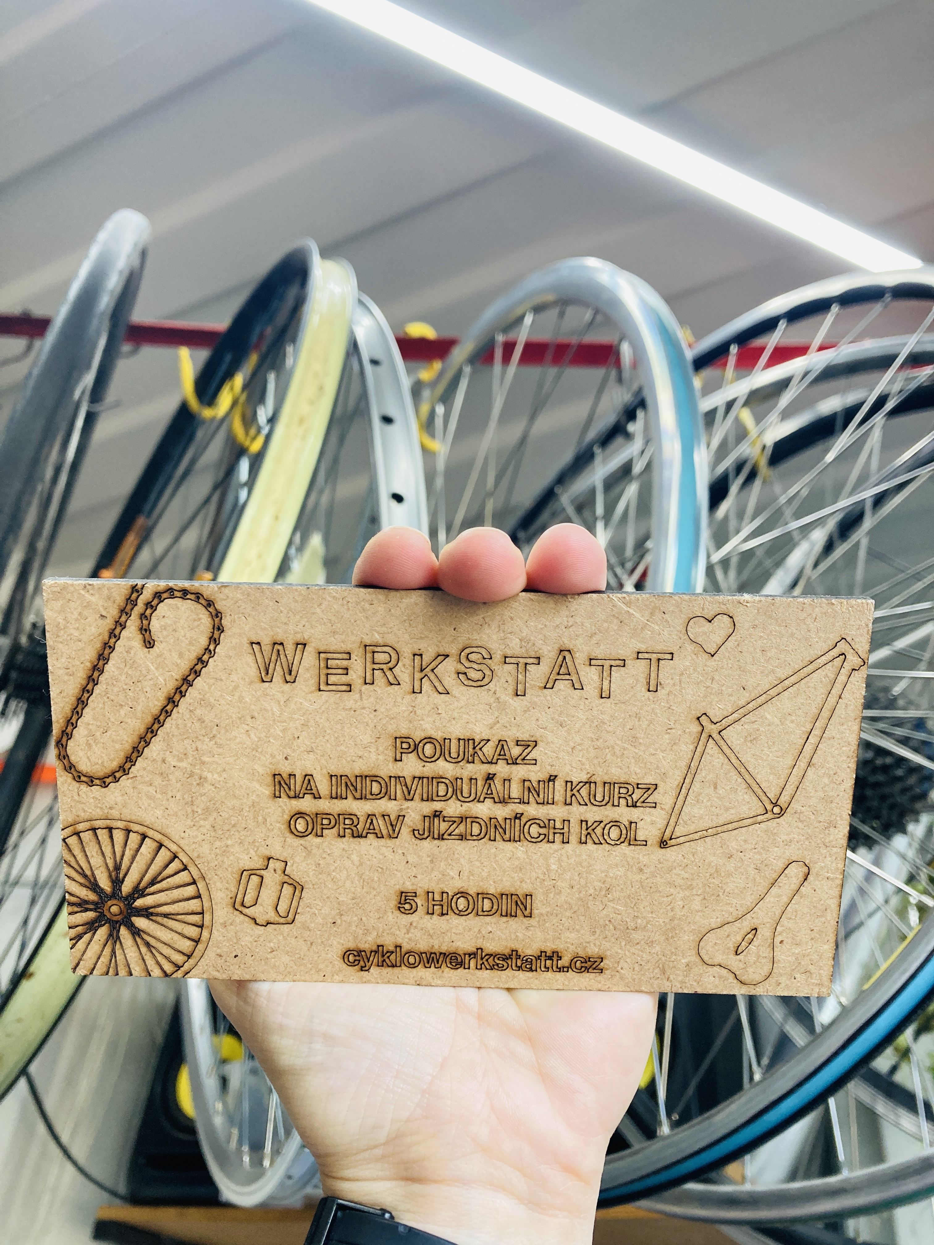 V nabídce našich služeb najdete i dárkové poukazy na kurzy cyklo-soběstačnosti (individuální nebo skupinové), na servis kol nebo na nákup zboží (jako jsou například cyklo-lékárničky, bidony, reflexní nálepky, omotávky, světýlka a další). Po domluvě vám rádi upravíme dárkový poukaz na míru vašich představ (například vygravírujeme jméno obdarovaného či vyspecifikujeme rozsah služeb). Pro více informací se nám neváhejte ozvat nebo se za námi zastavte do dílny.