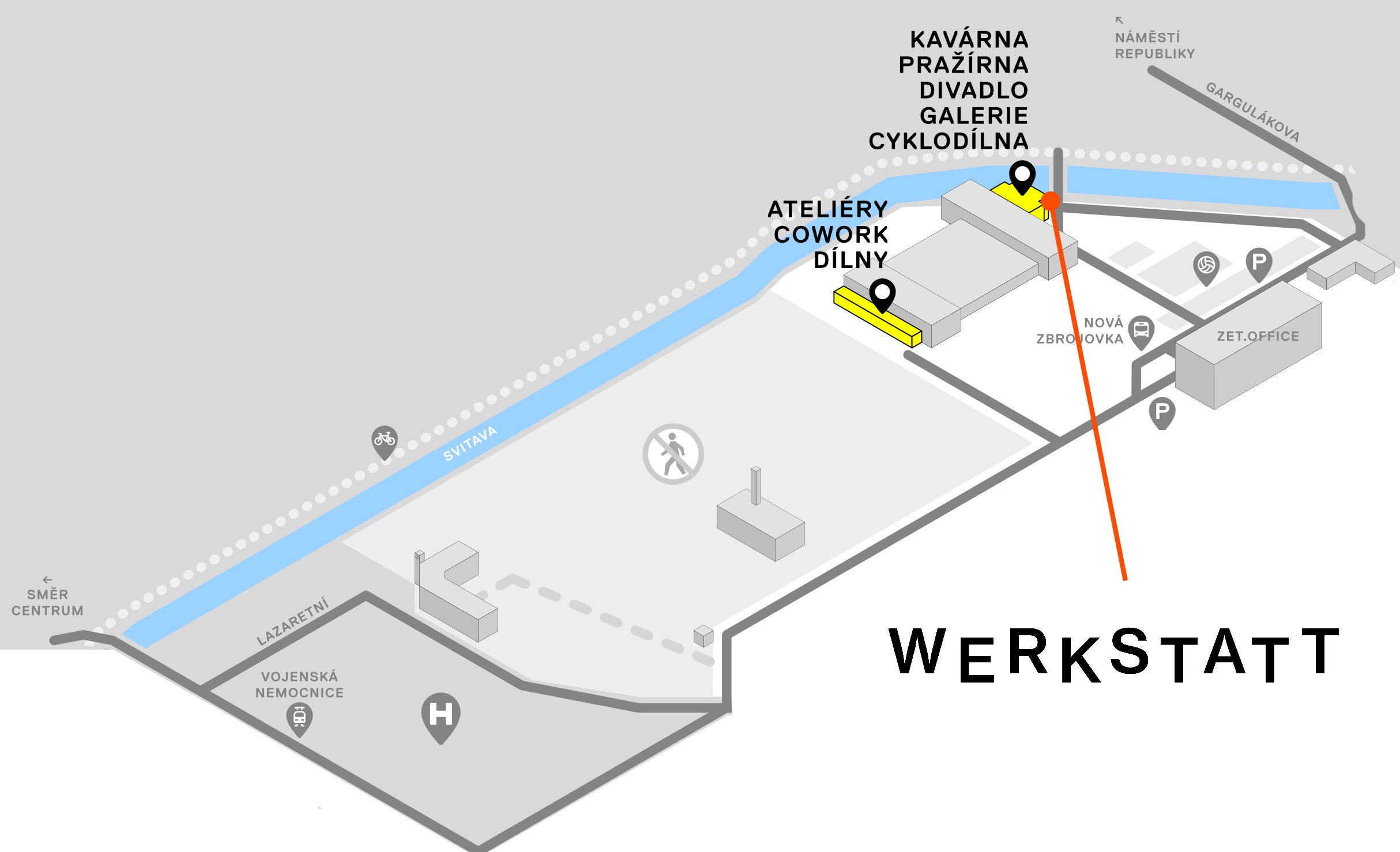 Nejbližší parkování je 100 m od WERKSTATTu a to před budovou ZET.office - projeťe závorami a vemte si lístek. Parkování 1 hod zdarma.